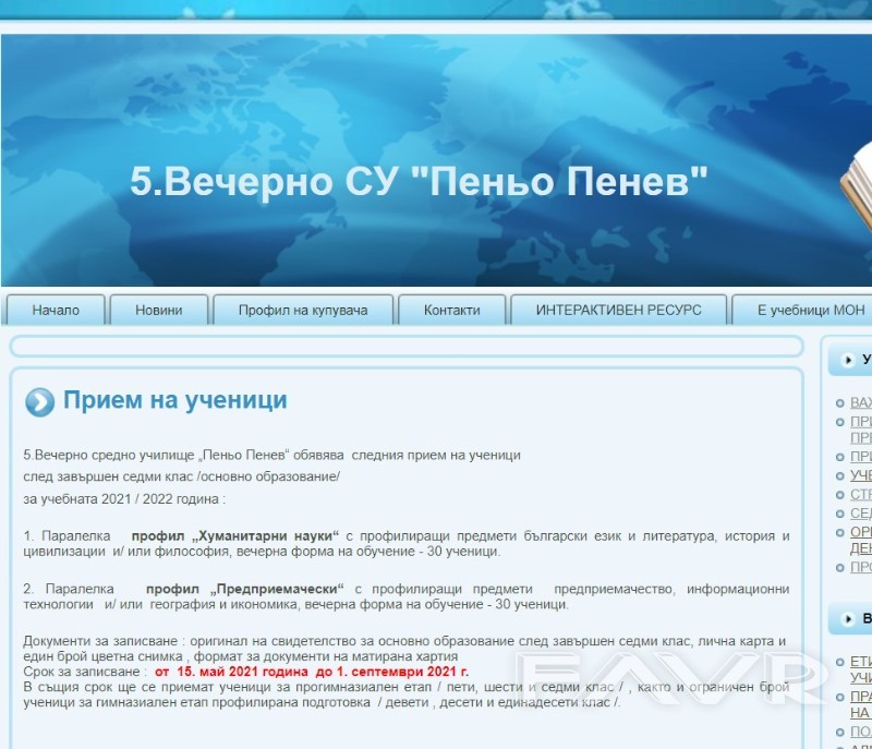 5.Вечерно средно училище „Пеньо Пенев“ обявява следния прием на ученици 2021-2022