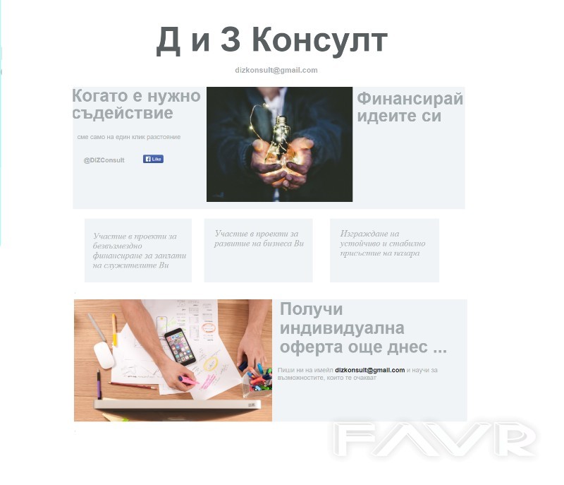 Д и З Консулт ЕООД е консултантска фирма, която предлага съдействие според нуждите на всеки клиент. Възползвайте се от безплатна първоначална консултация и научете как може да увеличите доходите си. Офертата е валидна както за юридически лица, така и за физически. В днешната динамично променяща се среда се разкриват ежедневно много възможности. Нужно е само да се свържете с нас и да научите какви са те.