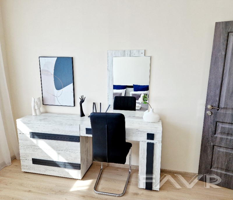 Разполага с изцяло оборудвана кухня с електроуреди, мощен климатик - 2 броя, голям гардероб с огледало, двойно легло с площ 160 см х 200 см с нощни шкафчета, разтегателен диван по поръчка с площ 140 см х 190 см , разтегателен фотьойл, превръщащ се в единично легло, TV шкаф, холна маса, портманто, маса за хранене, шкаф за обувки, оборудвана баня и тоалет.