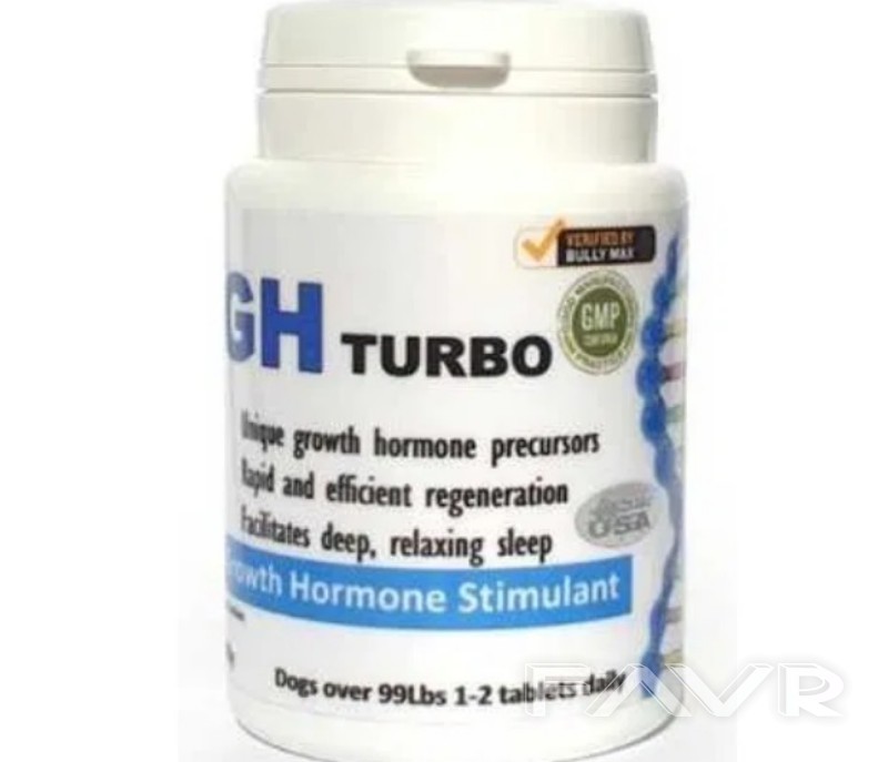 GH Turbo е мощен стимулатор на хормона на растежа. Ако бъде включено, като добавка към храната на кучето в млада възраст, може да увеличи размера на кучето ви с до 20%. Може да се приема от кучета на над 2 месечна възраст. Помага и за супер бързо възстановяване на кучето, след тежки физически натоварвания, рани или боледувания. Може да се приема от всички породи кучета. Дневна доза за кучета до 40кг. 1 таблетка, над 50кг. 2 таблетки на ден.