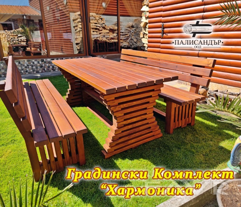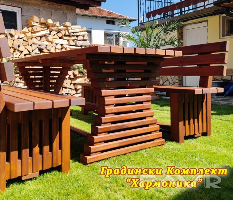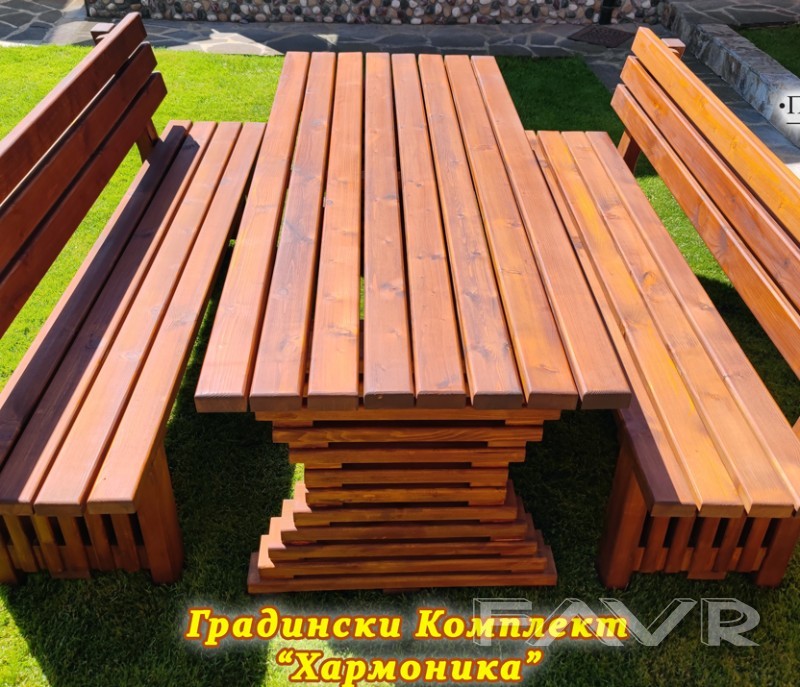 Изцяло дървен комплект с уникален и неповторим дизайн, състоящ се от 1 маса и 2 пейки с дължина 195см. Широчината на масата е 75см. Елементите за краката са залепени с висококачествено и водоустойчиво полиуретаново лепило. Материалът е импрегниран с "Таналит и Танатон", чрез потапяне във вана и след това е намазан с екстериорна вакса на водна основа с цвят Кестен на фирма Ювикс. Моля имайте предвид, че комплектът е масивен и тежък и се намира в производствената ни база в град Ракитово (област Пазарджик).