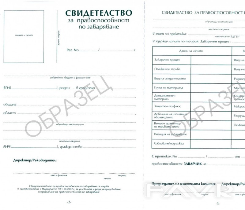 - СВИДЕТЕЛСТВО ЗА ПРАВОСПОСОБНОСТ ПО ЗАВАРЯВАНЕ по образец 3-116 на МОН с международна валидност