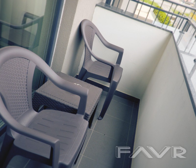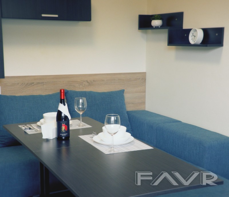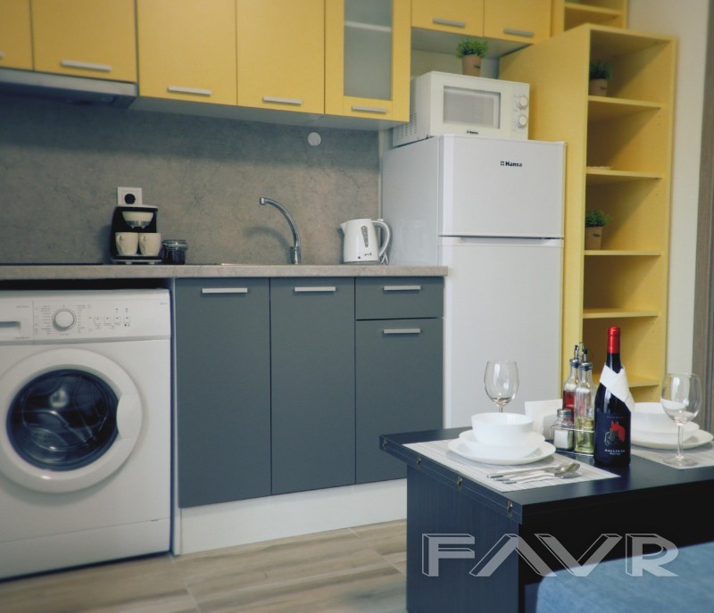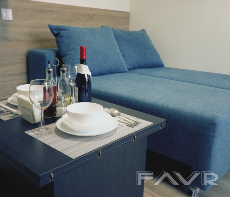Разполага с изцяло оборудвана кухня с електроуреди, мощен климатик, голям гардероб с огледало, многофункционален разтегателен диван по поръчка с площ 140 см х 190 см за двама души, преобразяващ се в 2 броя единични легла, както и в ъглов диван. Диванът е снабден с топ матрак и протектор. Апартаментът разполага с многофункционална холна маса с 3 функции- холна маса, работна маса, трапезна маса, както и с работно бюро. Голям гардероб с плъзгащи врати! Оборудвана баня и тоалет, както и удобна слънчева тераса.