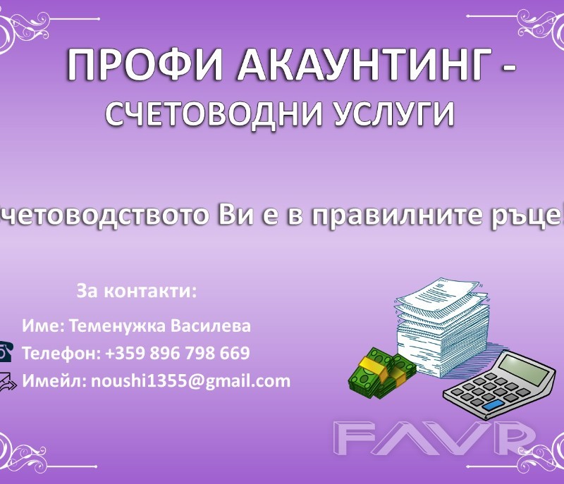 Profi accounting offers accounting services for your small or medium sized business - accounting services for your company, year completion, employment contracts and other. With our over 20 year experience in the different ranges of businesses, Profi accounting is the right choice for your company. We offer the opportunity for us to work via internet, scanning documents and with English communication as well.