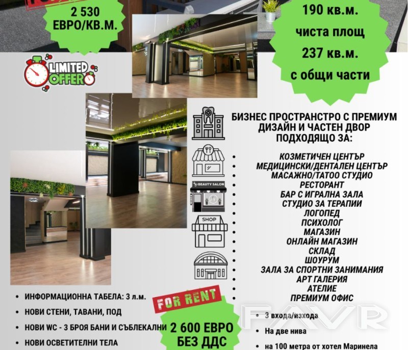 • Козметичен и здравен център – Пространството е подходящо за създаване на салон за красота или медицински/дентален център.