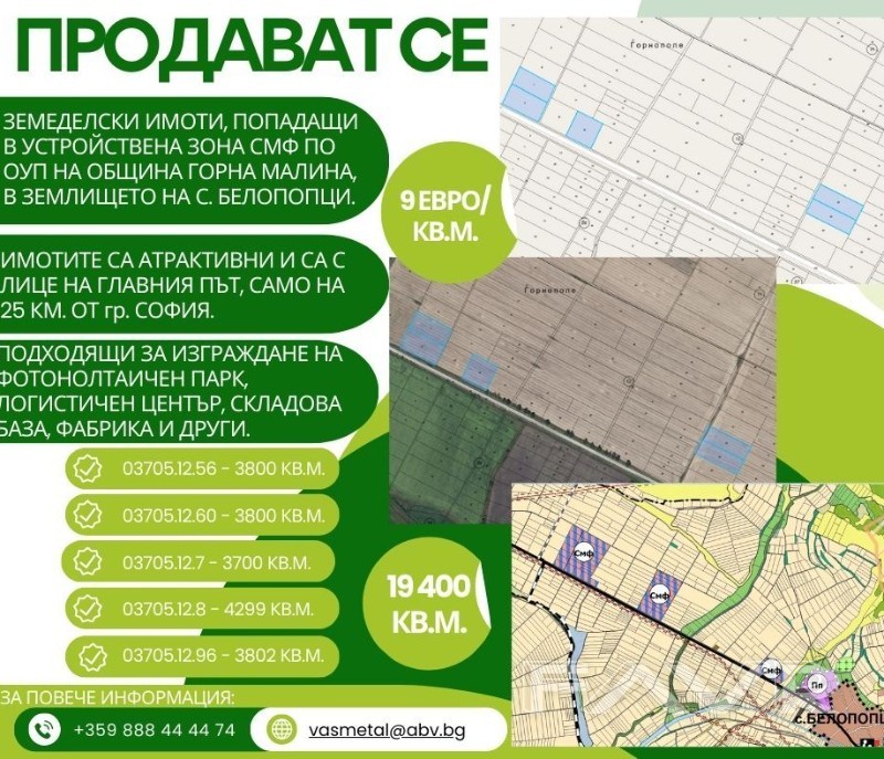 Продават се земеделски имоти попадащи в устройствена зона СМФ по ОУП на общ. Горна Малина, в землището на с. Белопопци. Имотите са атрактивни и са с лице на главния път, само на 25 км от гр. София. Подходящи за изграждането на фотонолтаичен парк, логистичен център ,складова база, фабрика и др.