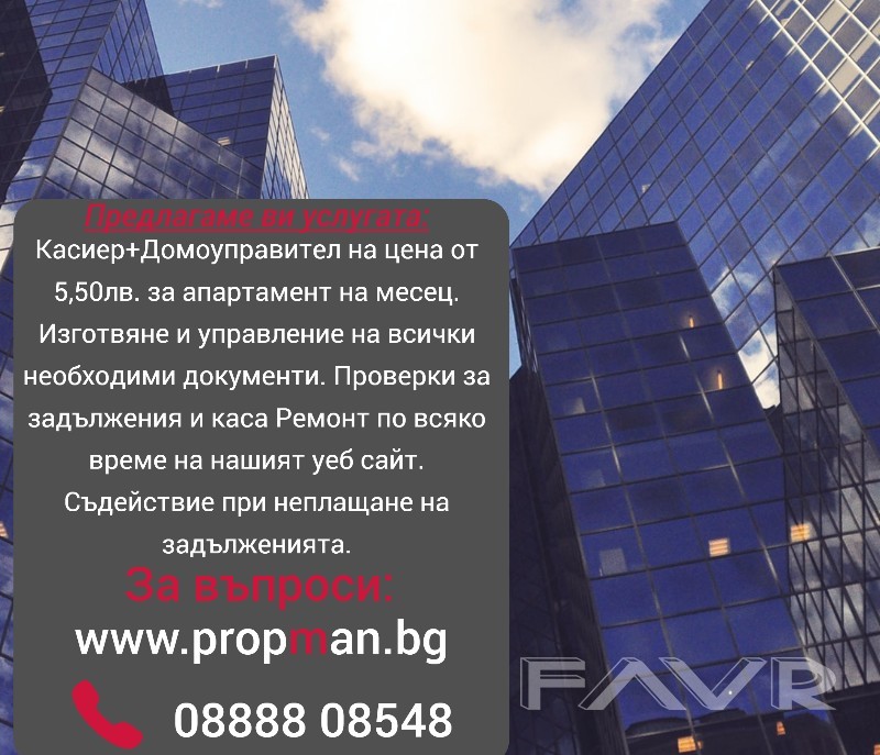 КАСИЕР + ДОМОУПРАВИТЕЛ 5,50 лв/месец/Апартамент