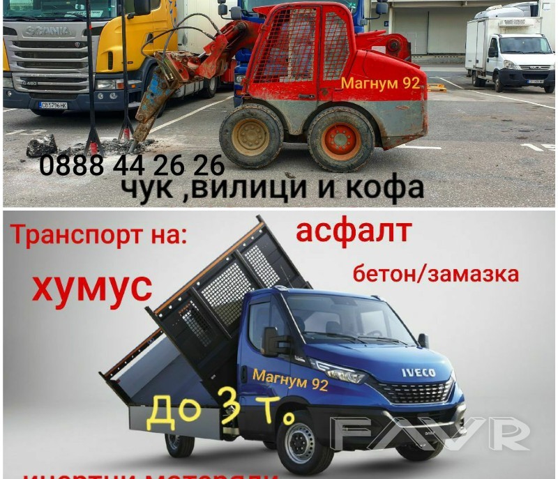 Предлагаме всякаква строителна механизация със оператор: комбинирани багери, мини челни товарачи (С хидро чук) , мини багери, валяци и др.. Транспорт на земни маси и инертни материали, механизиран изкоп, събаряне на сгради, вертикална планировка озеленяване, асфалтиране на малки и голямо площи, снегопочистване и др.