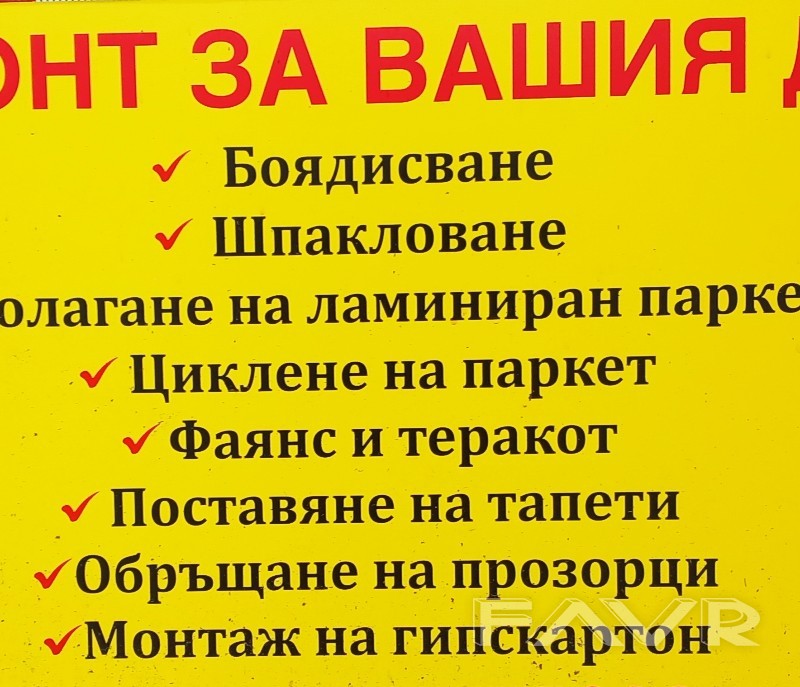 боядисване, шпаколоване, полагане на ламениран паркет , циклене на паркет , монтаж на гипскартон, фаяна и теракот